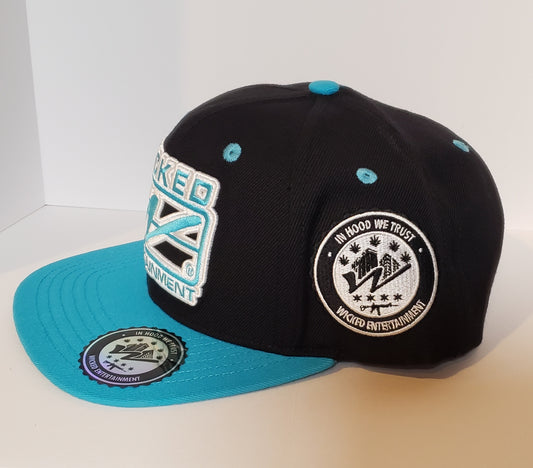 Wicked Logo Snapback hat - Black and Baby Blue with Blue Brim